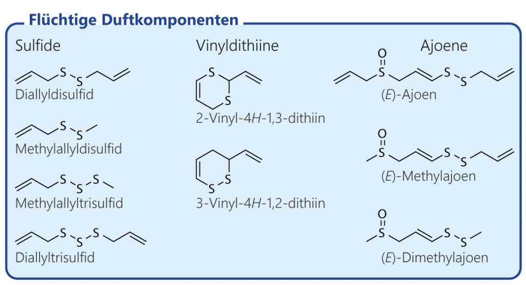 Interessanterweise macht es für den Geruchseindruck keinen großen Unterschied, ob wir Thiosulfinate, Sulfide, Vinyldithiine oder Ajoene riechen, da alle einen mehr oder weniger knoblauchähnlichen Geruch besitzen.