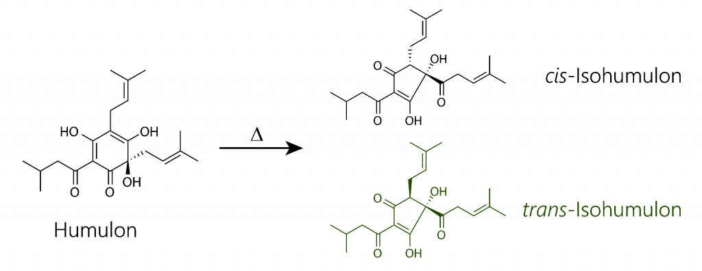 Der Hopfen wird während des Würzekochens der Würze zugesetzt. Dabei wandeln sich die thermisch instabilen Humulone in die entsprechenden cis– bzw. trans-Isohumulone um [2]. Vor allem letztere sind der eigentliche Hauptverantwortliche für den charakteristischen bitteren Biergeschmack.