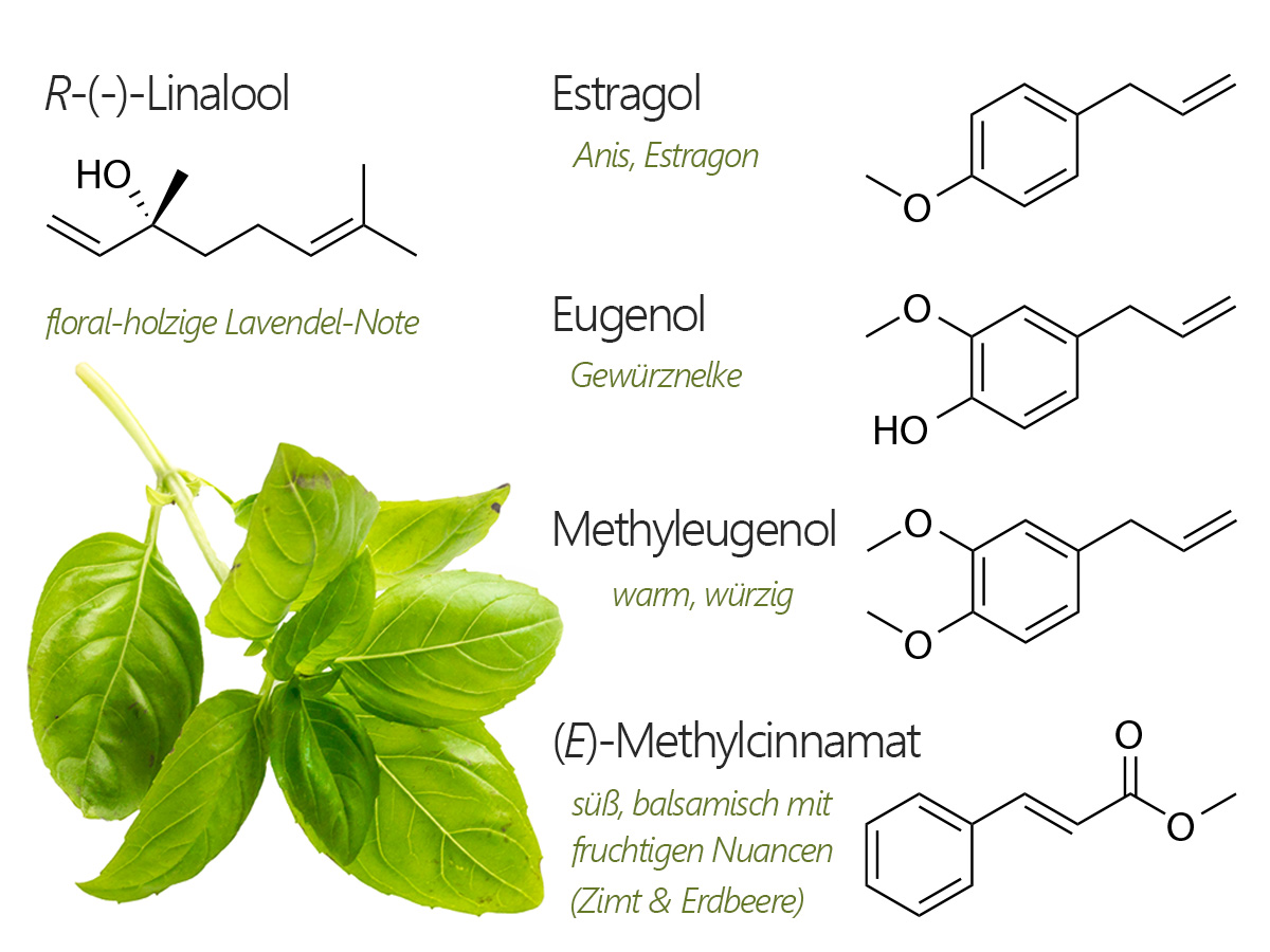 Zu dem Grüne Tomaten-Sorbet gibt es ein grünes Basilikum-Gelee. Das passt nicht nur farblich perfekt, sondern auch die Aromen harmonieren hervorragend. Wobei das Aroma von Basilikum (Ocimum basilicum) sehr unterschiedlich sein kann – es gibt mehrere sogenannte Chemotypen. Aber eines haben alle Chemotypen gemeinsam, sie passen gut zu unserem Sorbet. Das Aroma der in Europa vorherrschende Unterart – O. basilicum subsp. basilicum – wird vor allem von R-(‑)‑Linalool, mit seiner floral-holzigen Lavendel-Note, dominiert. Daneben spielen aber auch würzige Nuancen eine wichtige Rolle. So steuern Estragol und Methyleugenol wunderbar anisige bzw. warm-würzige Noten bei, Eugenol fügt einen Hauch von Gewürznelken hinzu und das balsamisch duftende Methylcinnamat, lässt Aromen von Walderdbeeren, Zimt oder auch überreifen Birnen erahnen [8,9,10].