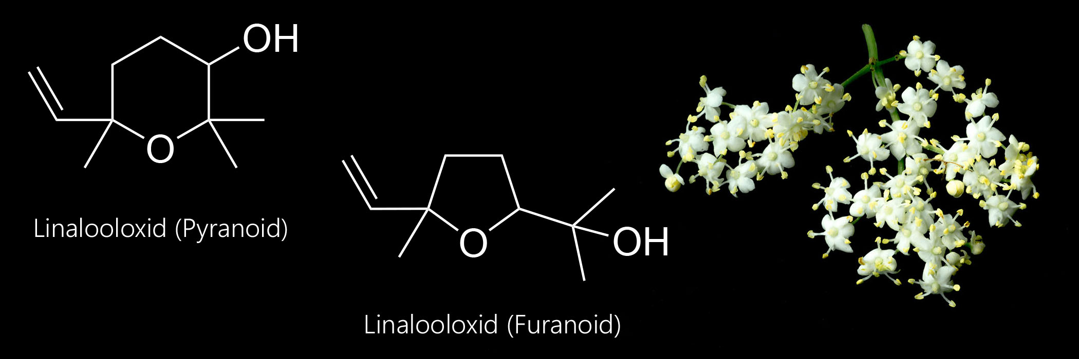 Ich habe das Glück, direkt am Grunewald zu wohnen und liebe es, dort spazieren zu gehen. Es ist immer wieder faszinierend, den Wald im Wandel der Jahreszeiten zu erleben. Jetzt im Frühsommer – zwischen Mitte Mai und Anfang Juni – ist der Wald vom Duft der Holunderblüten (Sambucus nigra L.) erfüllt. Ich bin ein ausgesprochener Fan des intensiven, angenehm blumigen Aromas, das die Holunderblüten verströmen. Falls es Dir ebenso geht und Du Dich je gefragt hast, nach was Holunderblüten eigentlich riechen, dann kann ich es Dir sagen. Der charakteristische Duft von frischen Holunderblüten wird von Linalooloxiden dominiert (>90 %) [1]. Dabei macht die Pyranoid-Form etwa 85 % und die Furanoid-Form etwa 9 % des Duftes aus.